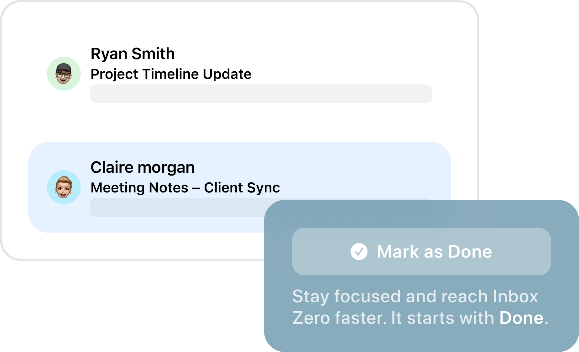 Clear your inbox faster with Mark as Done - one tap removes handled emails so you can focus on what matters. AI highlights important messages and keeps everything else out of the way.